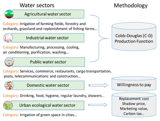 An evaluation framework for estimating the economic value of five water sectors is shown in Figure 4. The specific water usage and categories covered by each sector in this study are illustrated.