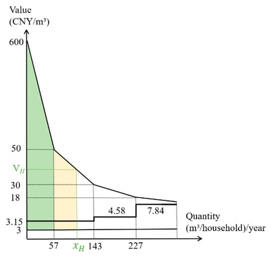 Block water pricing policy has been implemented in Chinese households in order to encourage people to save water []. Three block pricing policy shown in Figure 5a is adopted by most provinces; in general, it means the more water use, the higher water unit price. At least 85% of total families’ water use is covered in the volume of first block and 95% is within the second block. Domestic water sector is different from other sectors, since water is a final good, it can be valued by the economic surplus derived from the demand function using willingness to pay of household and water utility’s revenue [,]. The approach is to build average n-parts demand function for households in Yellow River basin illustrated in Figure 5b considering the water categories (Table 1) and the block water pricing policy (Figure 5a), since the households’ willingness to pay for water decreases with the increase of quantity and block water price. The first part of the demand function corresponds to basic water requirements, which are very highly valued (e.g., drinking), therefore the boundary of this part is determined by the volume of basic water requirements. The second part corresponds to intermediate needs (e.g., regular laundry) which are less valued than use of the first category, and the boundary is the volume of first block defined by block water pricing policy. The following parts of demand function corresponds to least-valued supplementary consumption, such as further indoor uses (e.g., leisure bath) or outdoor uses (pool, fountain, etc.), and the boundary between the third and fourth part is determined by the volume of second block setting by the block water pricing policy. The values of parameters of different parts of demand function will refer to the existing studies and related government reports which will be introduced in Section 3.5. At the end, the economic value of per household water use is the economic surplus of the demand function which is represented by the sum of the value of colored areas in Figure 5b.
