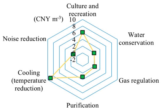 The urban ecological water is used for irrigating the green space in cities, and the value could be assessed by ecological service functions’ value of green space in cities [,]. The main ecological service functions of green space are water conservation, gas regulation, cooling (temperature reduction), purification, noise reduction, and culture and recreation [,]. The method of estimating the values of these functions mainly include the replacement cost, shadow engineering method, marketing value, and carbon tax [,,,,,,,].