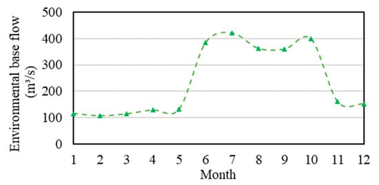 The environmental base flow is necessary to maintain the health of rivers in the development and utilization of river water resources. Since long-term series of monthly naturalized flow can be evaluated as in the above section, the Tennant method [], which is one of the most used methodologies to calculate environmental base flow, is adopted in this study. To be specific, the monthly environmental base flow can be derived by the average naturalized flow of each month of the long-term years multiplied by the specific percentage, and 30% [,] is taken in this study and to further obtain annual environmental base flow following Equation (18).