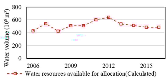The environmental base flow and available water resources that can be allocated are shown in Figure 11 and Figure 12. The monthly environmental flow at Lijin station is unevenly distributed during the year, the peaks of the environmental base flow occur from June to July and September to October, with the flows exceeding 300 m3/s, while the flows in the remaining months are approximately stable between 100–200 m3/s. The total amount of environmental base flow is about 7.50 billion m3 a year. Furthermore, the available water resources that can be used for the allocation of five human water sectors are obtained based on the total water resources of Yellow River minus the annual environmental base flow in lower reaches illustrated in Figure 12, with the average volume approximately 51.5 billion m3 a year from 2005 to 2017.