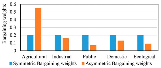 The bargaining weights under symmetric and asymmetric bargaining solution are shown in Figure 13. The results under asymmetric which considered the different importance of water sectors are based on the principles of equity and efficiency. The asymmetric weight of agricultural sector is 0.55 bigger than that of symmetric bargaining weight, while for industrial, public, domestic, and ecological water sectors, it is 0.16, 0.07, 0.13, and 0.09, respectively. Therefore, emphases should be placed on allocating water to the agricultural, industrial, and domestic sectors on the basis of achieving the maximization of economic benefits.