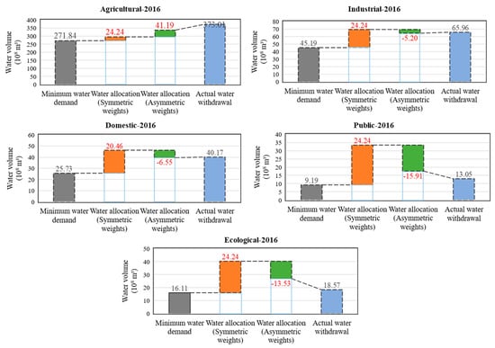However, for the asymmetric bargaining solution, it also considers the different importance among water sectors based on the principles of equity and efficiency, which makes the allocation results more reasonable. It can be found that compared with the allocation under symmetric bargaining solution, the amount of water allocated to agriculture under asymmetric bargaining solution increased by 4.20 billion m3 a year and the allocation value is 33.7 billion m3 in 2016. This is because the asymmetric bargaining weight of the agricultural sector is 0.35 larger than the weight under the symmetric model. The allocation results of industrial, domestic, public, and urban ecological sector under asymmetric bargaining model decreased by 0.52, 0.65, 1.59, and 1.35 billion m3 compared with those under the symmetric model, with the values of 6.42, 3.96, 1.75, and 2.68 billion m3 in 2016, respectively. Besides, Figure 15 donates that under symmetric and asymmetric Nash–Harsanyi bargaining game model, the agricultural sector should save 7.70 and 3.70 billion m3 compared with actual water allocation, respectively. It indicates that the agricultural sector should further improve irrigation efficiency to save water so that more water can be allocated to other sectors, thereby creating higher economic value for the entire society. The actual water allocation of the public and urban ecological sector is lower than that of the results of optimal water allocation under asymmetric Nash–Harsanyi bargaining game model, which means that water resources distributed to these two sectors were insufficient as shown in Figure 15.