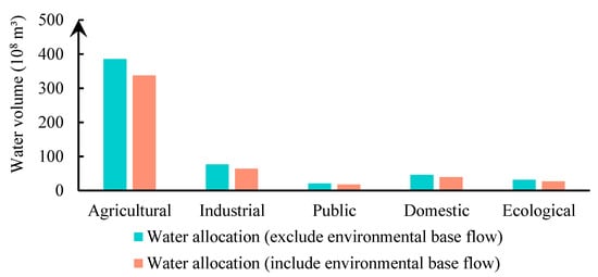 It is recognized that the relationship between economy and environment should be managed well in the development of society to realize the coordinated development of economy and environment. Protecting the natural ecosystem of rivers should be the foundation for fulfilling various human needs for water supplies. Therefore, this study took both different human needs for water resources and environmental flow requirements of river into account when assessing the optimal water allocation. As the results showed, at least an average of 7.50 billion m3 of water should be maintained in the river channel every year to sustain the balance and health of the river’s ecosystem, and how the remaining water resources should be allocated to different water sectors are shown in Figure 14. Besides, Figure 16 also shows the amount of water that will be allocated to each sector if the environmental base flow is not considered. It can be found that the allocation results among agricultural, industrial, domestic, public, and urban ecological water sectors are 38.6, 7.65, 4.57, 2.09, and 3.17 billion m3, respectively. Compare the allocation of water including environmental base flow, most of the water is allocated to the agricultural sector, which is 4.82 billion m3 a year, and the water allocation for other sectors is also relatively increased. Among them, the second largest increase is in the industrial sector, being 1.23 billion m3. Moreover, the increases in domestic, public, and urban ecological sectors are 0.61, 0.34, and 0.51 billion m3, respectively.