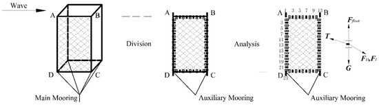 Regardless of the rotation of floating frame, the forces of all units of floating frame are accumulated in the global coordinate system, as shown in Figure 1. The forces mainly include wave force, net pulling force, buoyancy, and gravity. Then the acceleration of the floating frame is obtained according to Newton’s second law, as shown in the following Equation (5):