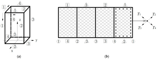 In order to make all mesh nodes, which are referred to as mass lumped points, we use the same number and tension of netting twine. In Figure 2b, the mass is not concentrated at the binding points, but at the solid dots. Therefore, among these points, the endpoints of four corners concentrated 3.5 times single fishing net’s twine mass and the other 3 times. Accordingly, the binding points on the circular tube parallel to the x and y axes are pulled by adjacent fishing net’s nodes, namely T1 and T2, while the binding points parallel to the z axis are pulled by adjacent fishing net’s nodes, namely T1 and T3, T2 and T4. According to the coordinates of the tie points and the coordinates of the mesh nodes, the vector sum of the force on the tie points can be obtained by decomposing netting twine’s tension.