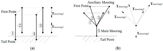 Calculation method of the two patterns of mooring. (a) Mooring mode and tension of four mooring rope. (b) Mooring mode and tension of four mooring rope of the auxiliary mooring rope matched with a main mooring rope.