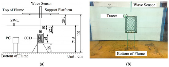 The physical modeling test was carried out in a wave tank at the School of Marine Engineering Equipment, Zhejiang Ocean University, China. The length, width, and height of the wave tank are 32 m, 0.8 m, and 1 m, respectively. The end of tank adopts a pore structure to eliminate waves. The water depth is 715 mm, the wave period is set as 1.1 s, 1.4 s, 2.1 s and 4.0 s, respectively, and the corresponding wave height is 4.58 cm, 166.3 mm, 112.3 mm, and 183.6 mm. There are four groups of wave properties, as shown in Table 3. The wave properties were statistically measured by the wave sensor above floating reef model in Figure 4. CCD camera was used to collect the continuous images of the trace points in Figure 4, and a program was written to analyze the images and obtain the motion changes of the model. The frame rate of image acquisition will affect the accuracy of data analysis in the later period. The more frames, the more accurate the trace track will be, and the higher the accuracy of the test results. The requirement can be met if the frame number is set at 10 per second. Therefore, the test recording time was 120 s and the number of frames was 10 per second. Each wave state was repeated three times in parallel.