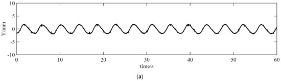 The numerical model of the floating reef is established according to the proportion relationship among parameters in Table 1. The trajectories of the tracers are calculated and then reduced to the scale of the physical model with λ = 20. Figure 5 shows the change of wave surface, which is acquired synchronously by the wave sensor and the CCD acquisition system. The still water surface is the base plane of the Y-axis. It can be seen that the wave case (1) in Figure 5 is a linear wave. As the wave height and frequency are increased under the condition of constant water depth, the wave trough will appear attenuation, so the wave case (2), wave case (3), and wave case (4) are nonlinear waves. The maximum wave height appears when wave case (4) occurs. This is because the end of the tank cannot completely eliminate the reflected wave that slightly affects the periodicity of the wave case (4) surface. Figure 6 shows the location and trajectory comparison of the tracer points in the physical model test and numerical simulation, and Table 3 shows the comparison of the maximum positive surging, negative surging and the maximum heaving. In particular, the origin of the coordinates in Figure 6 is the position of the tracer when the floating reef is stationary. Define the right side of the tracer point as the positive direction of the X axis, and the upper side as the positive direction of the Y axis. The origin is 225 mm below the still water surface.