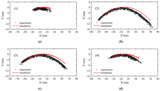 Movement track of the trace point of physical experiment and numerical mode under four group waves. (a) Wave case (1); (b) Wave case (2); (c) Wave case (3); (d) Wave case (4). The origin of the coordinates is the position of the tracer when the floating reef is stationary.