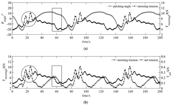 During curve of the pitching angle of floating reef, the tension of mooring rope, and total tension of fishing net’s tie points. (a) The relationship between the pitching angle of floating reef and the tension of mooring rope. (b) The relationship between the tension of mooring rope and total tension of fishing net’s tie points.