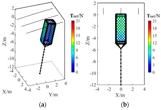 The motion state of the floating reef and the force distribution of fishing net at the maximum pitching angle. (a) 3D view. (b) Front view.