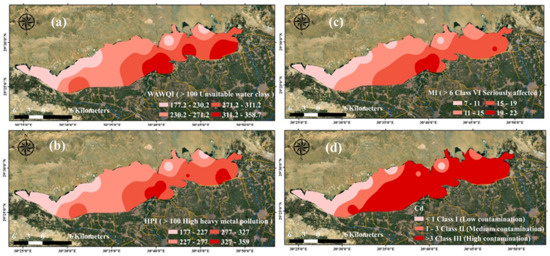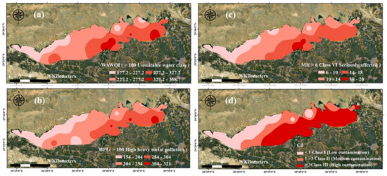 Spatial distribution maps of water quality indices in year 2019: (a) WQWQI, (b) HPI, (c), MI, (d) Cd.