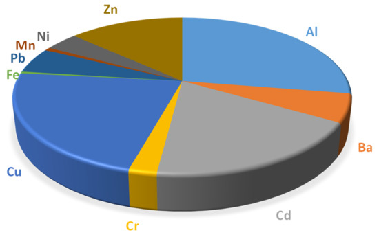 Based on the classification of PI levels, the PI data revealed two groups of trace element effects (Table 8). The PI values obtained demonstrated that Al had a severe impact on the surface water samples (Figure 4). (PI = 3.51), moderately affected by Cd (PI = 2.43) and Cu (PI = 2.76), and slightly affected by Zn (PI = 1.69), while there were no effects exerted by Ba, Cr, Fe, Pb, Mn, and Ni (PI < 1.0) as shown in Figure 4. The PI results revealed that the surface water points were strongly affected by Al and moderately affected by Cd and Cu, while slightly affected by Zn (Table 2). According to the obtained PI results, the high loadings of Al and Cu may be attributed to industrial activities, while the high loading of Cd and Zn revealed anthropogenic activities and poor sanitation infrastructure. For example, Goher et al. [26] applied PIs for assessing the water quality status in Wadi El-Rayan Lakes. According to metal index values, all selected surface water samples from the Lakes are seriously threatened with metal pollution, and the PI values showed that surface water of Wadi El-Rayan Lakes were slightly affected by Cr, and Pb and moderately affected by Cd and Cu, while no pollution effect by Fe, Mn, Zn, and Ni for aquatic utilization.