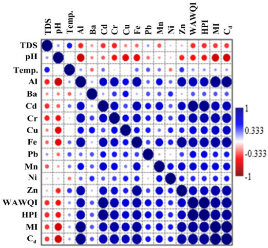 The correlation between physiochemical parameters, WAWQI and three PIs were computed via simple regressions as presented in Figure 5. The WAWQI vs. HPI, MI and Cd showed a high positive and significant correlation, with r = 0.91 for MI and Cd and with r = 0.91 for HPI. The significant correlation coefficients for the matrix of physiochemical parameters, WAWQI and three PIs varied from 0.51 to 1.00. The correlations among four water quality indicators and physiochemical parameters indicated that TDS, temperature, Ba, and Ni showed non-significant correlation with the four water quality indicators. On other hand, there were positive and strong correlation between four water quality indicators with Al, Cd, Cr, Cu, Fe, Mn and Zn and r varied from 0.64 to 0.95. Moderate correlation between WAWQI and HPI was found, with r = 0.59. Al showed the highest correlation coefficient with the MI and Cd with r = 0.95, Cd showed the highest correlation coefficient with the WAWQI and HPI, with r = 0.94 and Zn showed the highest correlation coefficient with the MI and Cd, with r = 0.85.
