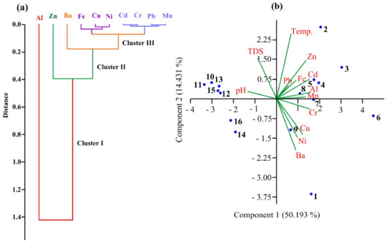 The CA was used to identify water quality changes and to classify various physicochemical characteristics by transforming the initial variables into a new set of variables associated with water. Three forms of clustering were discovered in the CA findings for trace elements, including Al and Zn (Cluster I). Another cluster includes Ba (Cluster II), which was further split into two sub-clusters, one representing Fe, Cu, and Ni and the other representing Cd, Cr, and Mn (Figure 6a). High contributions of Al, Zn, and Ba may be attributable to industrial and agricultural wastewater arising from human actions, according to the CA of the physicochemical (Figure 6a). Trace elements such as Fe, Cu, Ni, Cd, Cr, Pb and Mn are included in a distinct cluster, revealing anthropogenic activities and quickly increasing industry sectors in Fayoum Province. Therefore, the main causes of trace element pollution in Qaroun Lake revealed industrial leaching and precipitation with increasing human activities [76,77].
