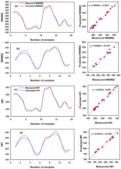 The SVMR algorithm is a machine learning theory that can be used to classify and recognize patterns. Version 10.2 of the unscramble X program (CAMO Software AS, Oslo, Norway) was used to construct the SVMR models. The SVMR model was used to establish calibration (Cal.) and validation (Val.) models of the WAWQI based on three physical parameters and ten trace elements as input data and for PIs with respect to ten trace elements (Table 1). For example, the SVMR of calibration model for testing a single dependent variable (e.g., contamination index (Cd) used several independent variables (e.g., Al, Ba, Cd, Cr, Cu, Fe, Pb, Mn, Ni and Zn). The measured datasets were randomly divided into two sets of progressions, 67 percent training and 33 percent testing datasets, to construct the models. The performance of SVMR for (Cal.) and (Val.) models was evaluated to predict the WQIs based on four criteria (determination coefficient (R2), root mean square error (RMSE), mean absolute deviation (MAD), and accuracy (Acc). The optimal model was selected based on the lowest RMSE and MAD, as well as the highest R2 and Acc.