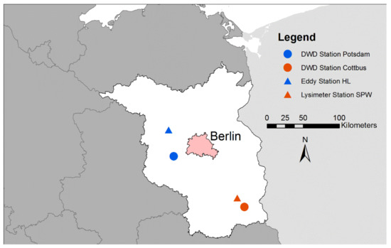 The measurement sites in HL and SPW are equipped with automatic weather stations for recording the air temperature, precipitation, net radiation, ground heat flux, relative humidity, and wind speed. The weather station in SPW measures at 1-min intervals. In HL, the sensors are part of an eddy covariance station that measures at 20 Hz and stores 15-min values. The measured values are aggregated to form daily average values or daily sums. ET0 and CWB are then calculated from the daily values according to Equations (1) and (2).