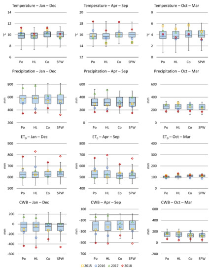 In addition to the air temperature, precipitation P, and ET0, the climatic water balance (CWB) is used to assess the long-term climatic characteristics of the sites in the measurement years from 2015 to 2018.