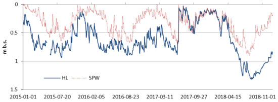 Daily average water table depths below surface in Havelländisches Luch (HL) and Spreewald (SPW) from 2015 to 2018.