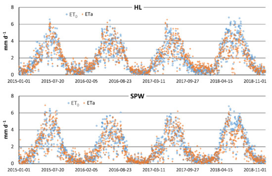 The annual sums of the ET0 values and also the sums from April to September are significantly higher at both sites in 2018 than in the other years (Table 3). The sum ETa values (Table 3) fall short of the ET0 values in the dry year 2018, as the plant stand has an insufficient water supply. This is due to the low water table depths (Figure 3). The annual sum of ETa in the wet year 2017 differs only slightly from the sum of the dry year 2018 (+6 mm in HL, −7 mm in SPW), although there are large differences in ET0 (−172 mm in HL, −138 mm in SPW). The shallow unsaturated soil zone dries out strongly in 2018; the roots of the plants no longer reach the capillary fringe. As a result, ETa is reduced, which is untypical for wet grassland sites with shallow water table conditions. In the case of the HL values, the station failures in some years must be taken into account (Table 3). Some days are, thus, missing for the ET0 (15 days in 2015, 11 days in 2016) and ETa (34 days in 2015, 13 days in 2016, 26 days in 2017, and 9 days in 2018).