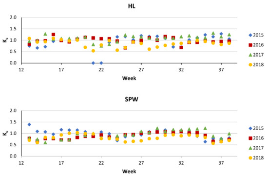 Weekly values of the crop coefficient Kc in Havelländisches Luch (HL) and Spreewald (SPW) in the vegetation periods from 2015 to 2018 (Week—week of the year).