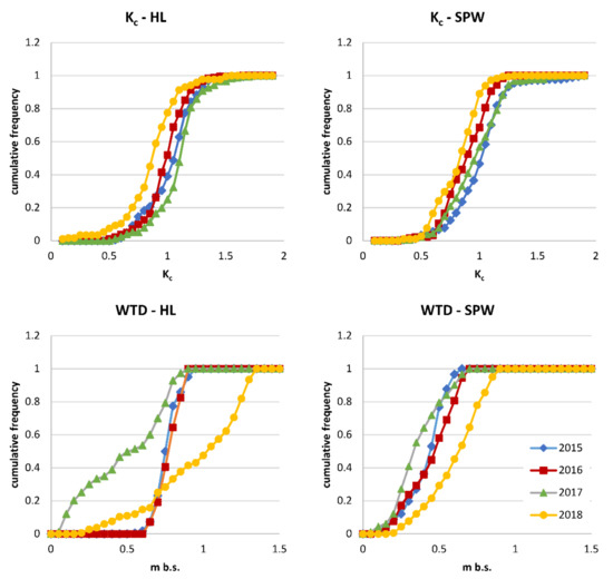 The cumulative frequencies of the Kc values and the corresponding water table depths in the vegetation periods of the four years underline the differences between the dry and wet years and their effects on the water balance (Figure 6). They show that the range between dry and wet conditions is larger in HL compared to SPW and that the Kc values are higher in HL, although the water table is almost always lower in HL.