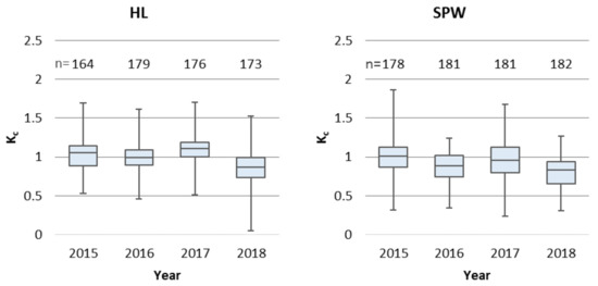 Whisker plots of the Kc values at the Havelländisches Luch (HL) and Spreewald (SPW) sites in the vegetation period from April to September in the years 2015 to 2018 (n—number of values per vegetation period).