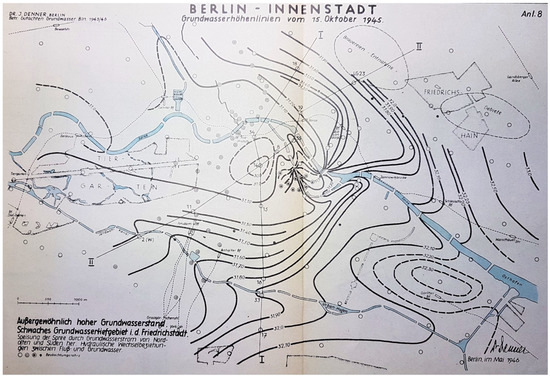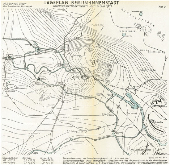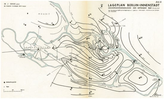 - Denner, J. Gutachten über die Grundwasser-Verhältnisse und den hohen Grundwasserstand in der Innenstadt Berlin im Jahre 1945/46; Magistrat Groß-Berlin: Berlin, Germany, 1947. [Google Scholar]