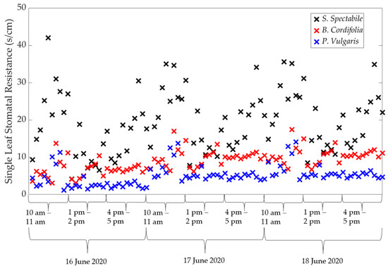 Leaf stomatal resistance values from the S. spectabile, B. cordfolia and P. vulgaris species between 16 and 18 June 2020.