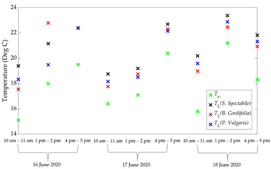 Average leaf temperature (TL) from S. spectabile, B. cordfolia and P. vulgaris species and local air temperature (Ta) over 9 hourly periods between 16 and 18 June 2020.
