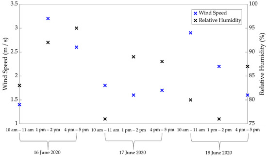 Wind speed and relative humidity measured in each hourly investigative period between 16 and 18 June 2020.