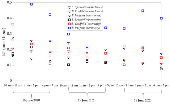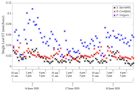 It would be expected to find the highest ET levels in the middle of the day when there is greater exposure to the sun’s solar radiation [35]. This is only evident in the porometry data for S. spectabile. The results in Figure 6 are scattered with respect to time of day. This is not surprising for three days of data, as the interacting effects of temperature, radiation, wind and humidity could be very different with time. A larger dataset in a further study will be required to confirm these diurnal trends from all plants.