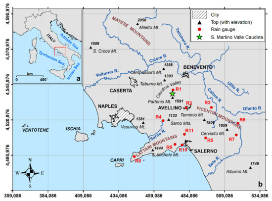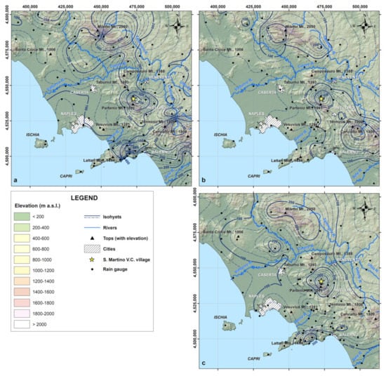 Our findings indicate that the historical debris flows which have affected the S. Martino V.C. area in recent times were related to severe and extreme rainfall events having durations ≥ 12 h, as no landslide occurred for powerful rainfall of shorter durations (≤6 h). Moreover, significant changes in the intensity of the rainfall events were not observed during the time. In particular, it was found that the intensity of the rainstorms of a duration ≥ 6 h is not increasing.