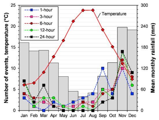 Table 7, it appears that short–heavy rainfall (Z ≥ 1.5 for a duration ≤ 6 h) would not cause landslides; that is, it is statistically improbable that short–heavy rainfall events could cause debris flows under these climate conditions in this area. Here, short–heavy rainfall (i) generally occurs during the beginning of the rainy season (September–November period,