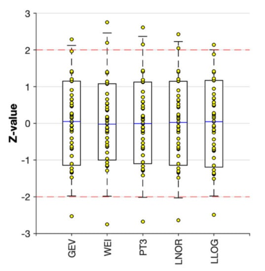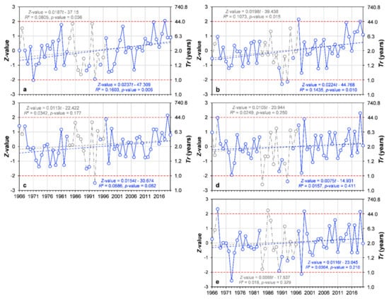 22]. Instead, the Z-value remains fixed on the observed data series and would not provide any indication regarding the recurrence of these events in the future. For example, an event with a return period of 100 years means that it occurs statistically every 100 years, which is potentially a misleading result when the stationary of the time series cannot be guaranteed. For this reason, the use of the Z-value overcomes considerations about the stationarity of the time series, which is a debated topic in the literature (cf. References [