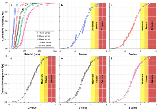 For a 12-h duration event, the Z-value is between 1.46 (maximum Z-value of the 12-h rainfall which failed to induce landslides, November 1997) and 1.89 (minimum Z-value of the 12 h which induced landslides), corresponding to 130.0 and 155.4 mm of rain, respectively. For a 24-h duration event, the Z-value is between 1.57 (maximum Z-value of the 24-h rainfall which failed to induce landslides, November 2010) and 2.14 (minimum Z-value of the 24 h which induced landslides), corresponding to 187.6 and 248.8 mm of rainfall, respectively.