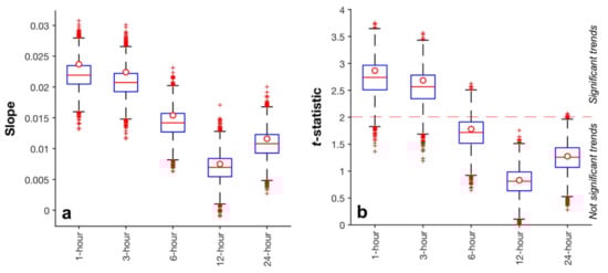 44] found statistically significant positive trends in the 1-h maximum annual rainfall time series only in 14% of the analyzed rain gauges; for 3-, 6- and 12-h durations, positive trends were detected at about 4–6% of the stations; for the 24-h duration events, no positive trends were found.