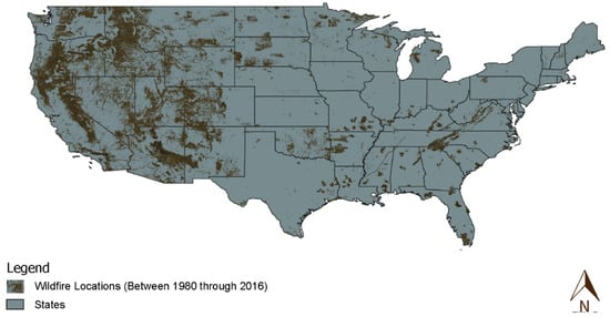 - ArcGIS. US Wildfires 1980–2016. Available online: https://hub.arcgis.com/datasets/tga::us-wildfires-1980-2016 (accessed on 21 April 2021).