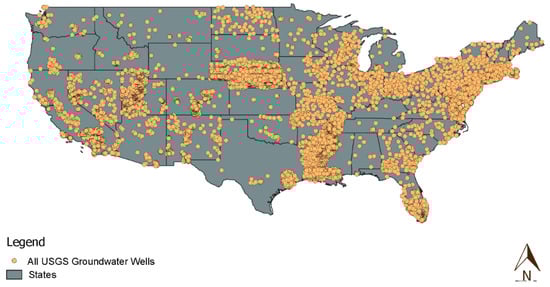 Since this study requires wildfires with nearby groundwater wells, publicly available geographic information system (GIS) datasets were employed to calculate the distance between each wildfire centroid and the nearest monitoring well. Specifically, two GIS datasets were utilized for the purposes of this study. First, the dataset Wildfire_all_1980_2016 [] is a shapefile and point dataset providing approximate coordinates for the centroids of all recorded wildfires within the contiguous United States from 1980 to 2016 (Figure 1). The data also include descriptive information about each wildfire including its name, size class, date started, and the date contained. A total of 595,158 wildfires are included in this dataset. Second, the dataset USGS_Monitoring_Wells [] is a shapefile and point dataset providing coordinates for all USGS monitoring wells within the contiguous United States (Figure 2). The data also include descriptive information about the vertical datum used to measure well depths. A total of 17,754 groundwater wells are included in this dataset.