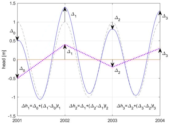 where h2 is groundwater level, h1 is average head (averaged over all data), a is amplitude [m], t is time [d], and τ is phase shift [d]. The amplitude and phase shift are determined by minimizing the sum of the squared error using Matlab’s function fminsearch, which performs multidimensional unconstrained nonlinear minimization using the Nelder-Mead method []. A piecewise linear precipitation adjustment was added to account for years with higher or lower precipitation (Figure 3):