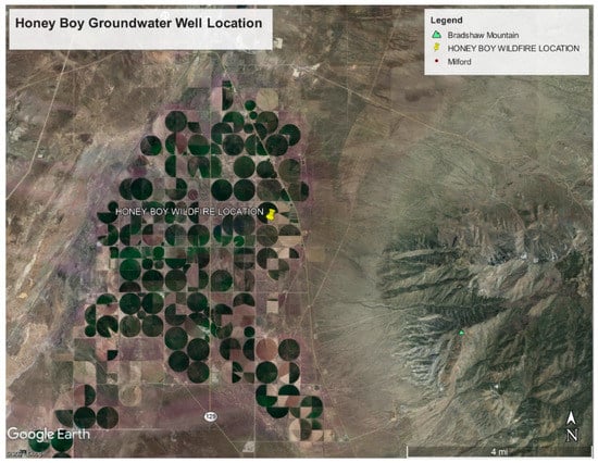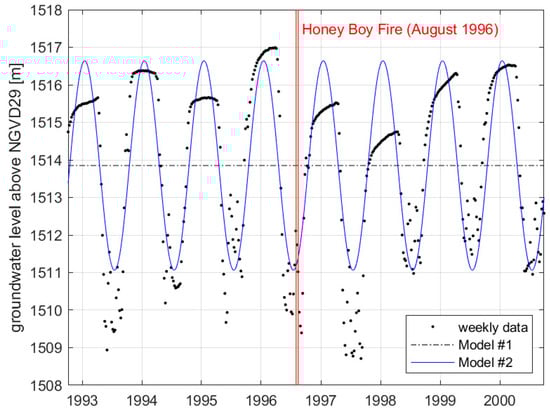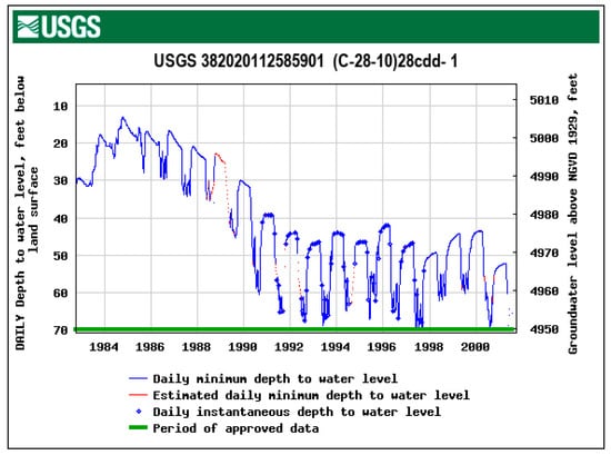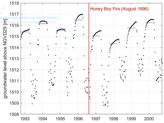 The one groundwater well that met all the search criteria was near the Honey Boy Fire of August 1996 (Figure 4), a 3100 ha (7600 ac) wildfire in Beaver County, Utah, USA []. According to data provided by USGS for Site Identification Number 382020112585901, this well has NAD27 coordinates latitude 38°20′20″, longitude 112°58′59″ (converted to NAD83 for the purposes of this study), surface elevation 1529.79 m (5019.00 ft) above NGVD29, hole depth 110 m (360 ft), and well depth 105 m (345 ft). It is located in hydrologic unit 16030007 and completed in the local aquifer designated Valley Fill (100VLFL). This well was located 790 m from the centroid of the Honey Boy Fire, which was a Type G wildfire (assumed equivalent diameter of 3589 m) that burned from 2–15 August 1996. This meant that the well had an empirical weight of w = 0.78, which was within the scoring range considered. Figure 5 shows the entire range of the recorded data measured during the lifetime of this well.