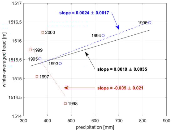 Winter-averaged groundwater level versus annual precipitation each 1 February. The correlation for all eight years (1993–2000) is a black solid line; the correlation for pre-wildfire years (1993–1996) is a blue dashed line; the correlation for post-wildfire years (1996–2000) is a red dotted line. Each slope is reported as a 95% confidence interval using the t-test with 7 degrees of freedom when n = 8 and with 3 degrees of freedom when n = 4. Only the pre-fire correlation is significant.