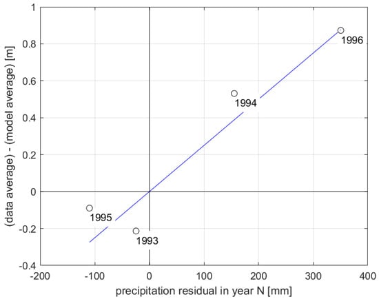 where h3 is precipitation-adjusted groundwater level, S is a scale factor, pi is the annual precipitation residual of the current calendar year, pi−1 is the total annual precipitation residual of the previous calendar year, and ti is time [d] in the current year. The precipitation residual is defined as:
