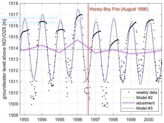 where α = 419 is the scale coefficient of the Gaussian bell curve, σ = 106 d is its standard deviation, and μ = 1835 d is the time from the beginning of the groundwater data record to the low point of the Gaussian bell curve (i.e., 434 days or about 14 months after the beginning of the wildfire). The constant before the exponential function is 419/106/(2π)1/2 = 1.58 m, which is the maximum deviation from the precipitation-adjusted sinusoidal model #3. This final model has been plotted in Figure 11, revealing an identical fit to pre-fire groundwater levels and a 6.3% improvement to the full sample period (Table 4).