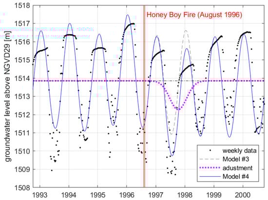Fire-adjusted model #4 does not change the RMSE for the pre-fire period but provides a 6.3% improvement for the post-fire period (Table 4). The impact of the Honey Boy Fire is modeled as a Gaussian deviation from the precipitation-adjusted model #3, where the Gaussian deviation is centered 434 days after the beginning of the fire, with a standard deviation of 106 days, and a maximum groundwater level depression of 1.58 m.