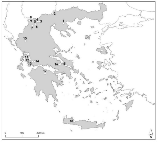 Map of the surveyed freshwater lakes in Greece. See Table 1 for lake names.