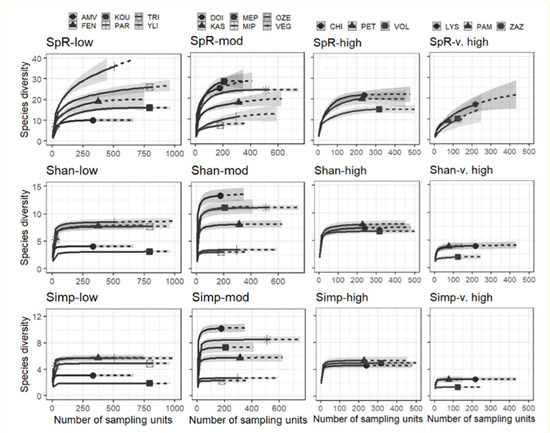 Rarefaction curves of species richness (SpR), Shannon index values (Shan), and Simpson index values (Simp) for the 18 lakes (see Table 1 for lake codes) divided into four trophic groups (low: low trophic group; mod: moderate trophic group; high: high trophic group; v. high: very high trophic group). The solid part of the lines predicts the rate of accumulation of the diversity metric values in each lake with increasing number of sampling units (relevés) by interpolation of data, while the dashed part of the lines continues the same predictions by extrapolation. The curve of the Yliki lake (low trophic group) is hardly visible because of its small length (small number of relevés) and its overlap with the curves of other lakes.