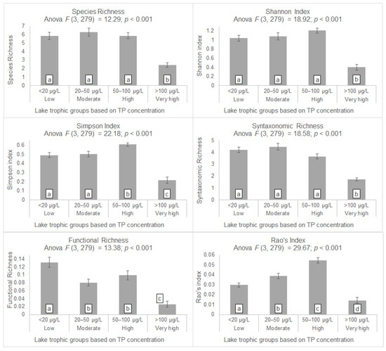 Mean species richness, Shannon index values, Simpson index values, syntaxonomic richness, functional richness, and Rao’s quadratic entropy in lake transects, grouped according to annual mean total phosphorus (TP) content in each lake’s water column (low, moderate, high and very high trophic groups). Standard error bars for all mean values are given. One-way ANOVA results (degrees of freedom, F statistic, and p-value) for each diversity metric are presented in each graph’s headline. Statistically significant differences of diversity means in consecutive trophic levels, according to TukeyHSD multiple comparison for 95% family-wise confidence level, are indicated by different alphabet letters among a, b, c and d.