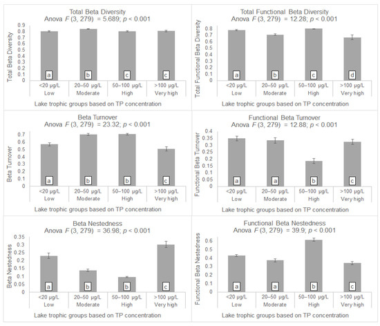 Mean taxonomic and functional beta diversity values and their partitions, turnover and nestedness, in lake transects, grouped according to annual mean total phosphorus (TP) content in each lake’s water column (low, moderate, high and very high trophic groups). Standard error bars for all mean values are given. One-way ANOVA results (degrees of freedom, F statistic, and p-value) for each diversity metric are presented in each graph’s headline. Statistically significant differences of diversity means in consecutive trophic levels, according to TukeyHSD multiple comparison for 95% family-wise confidence level, are indicated by different alphabet letters among a, b, c and d.